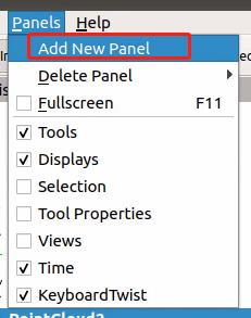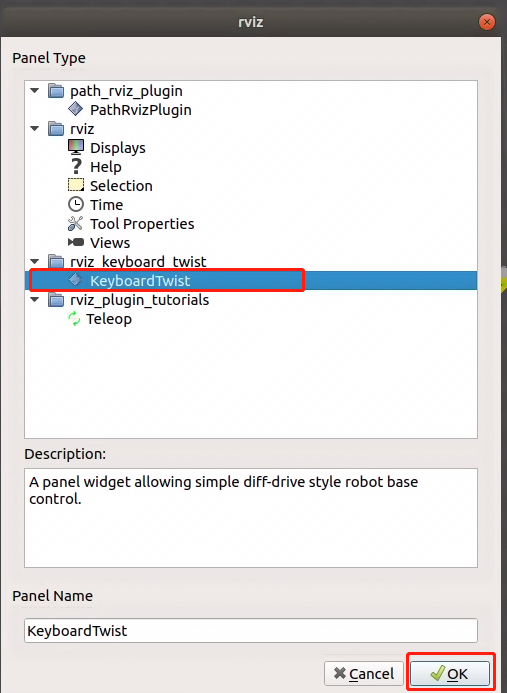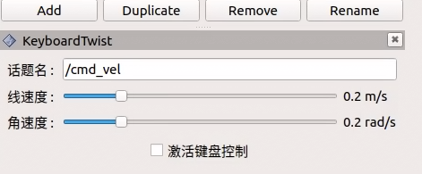 RViz 的左上角依次点击 Panels -> Add New Panel -> rviz_keyboard_twist -> KeyboardTwist